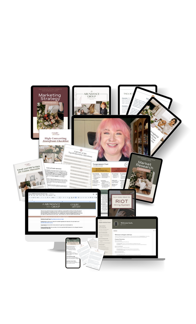At The Abundance Group (TAG), we are a community of resilient, kind, and resourceful wedding professionals who support and uplift one another. Led by Ashley Ebert, a leading wedding business coach.